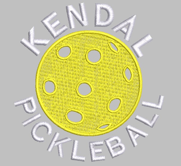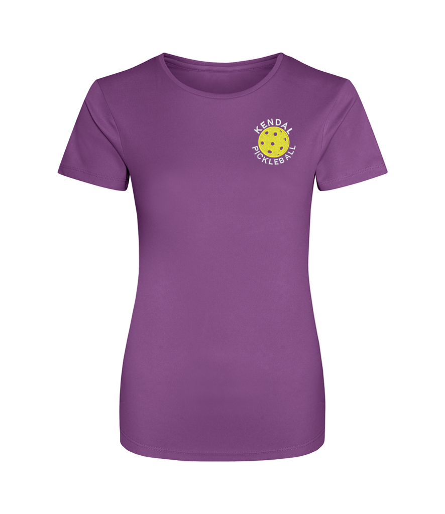 Ladies t-shirt with printed Kendal Pickleball ball logo.